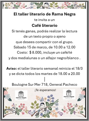 10/03/2025 Agenda by info@ramanegralibros.com Café literario Sábado 15/03 10:00 hs. Reservá Read more